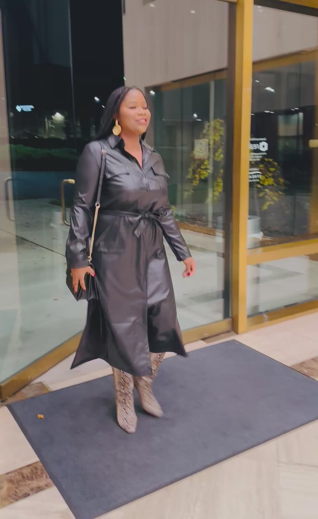 This faux leather shirt dress delivers a tailored silhouette with modern edge — structured yet fluid, refined yet bold.