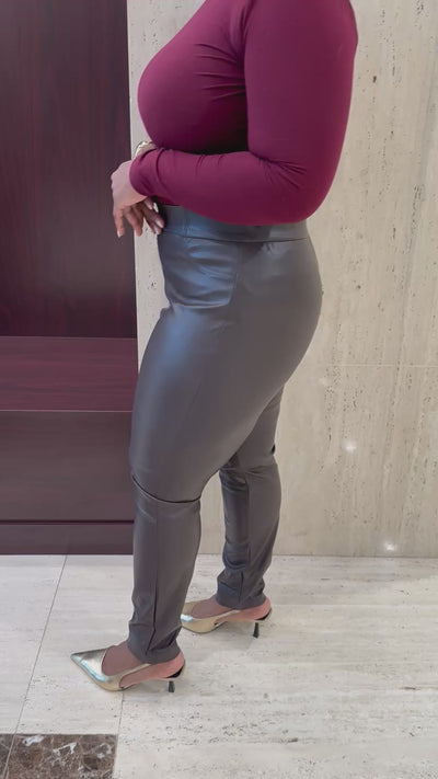 Crafted from a soft, stretchy 100% polyester blend with a coated finish, they balance structure and comfort effortlessly. The high-rise waistband holds you in, while the subtle sheen gives that rich, elevated edge that defines the Leather + Layers collection.