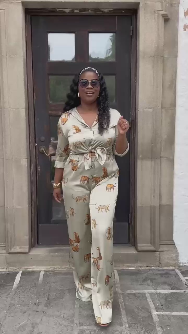 An easy, standout set designed for warm days and stylish getaways. The satin-like button up tunic features long sleeves that can be worn down or rolled up for a laid-back vibe, giving you versatility for any destination. Paired with high-waisted, wide-leg pants featuring an elastic waistband and roomy side pockets, this look blends comfort with effortless style.